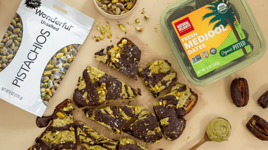 A deliciously indulgent treat featuring layers of rich chocolate, chewy dates, and crunchy Wonderful® Pistachios No Shells Unsalted, perfectly balanced for a sweet and nutty bite.